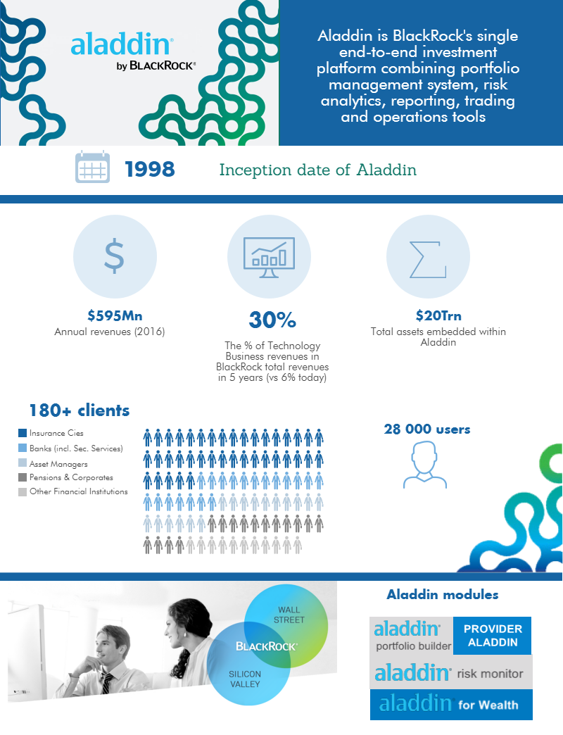 Từ một hệ thống “tiết kiệm thời gian giản đơn” được tạo ra khi đại đa số New York vẫn còn thờ ơ (hay ngủ quên), hệ thống máy tính của BlackRock đã phát triển thành hệ điều hành của một công ty mà bản thân nó dần vươn vai trở thành nhà quản lý tài sản tài chính lớn nhất trên thế giới. Hệ thống này được nhiều người biết đến là Aladdin, một tập hợp các trung tâm dữ liệu – những khu nhà kho chứa đầy máy chủ (servers) – được sử dụng bởi 13000 nhân viên của BlackRock và hàng ngàn khách hàng của công ty, những người chi trả cho các phân tích mà hệ thống này cung cấp.