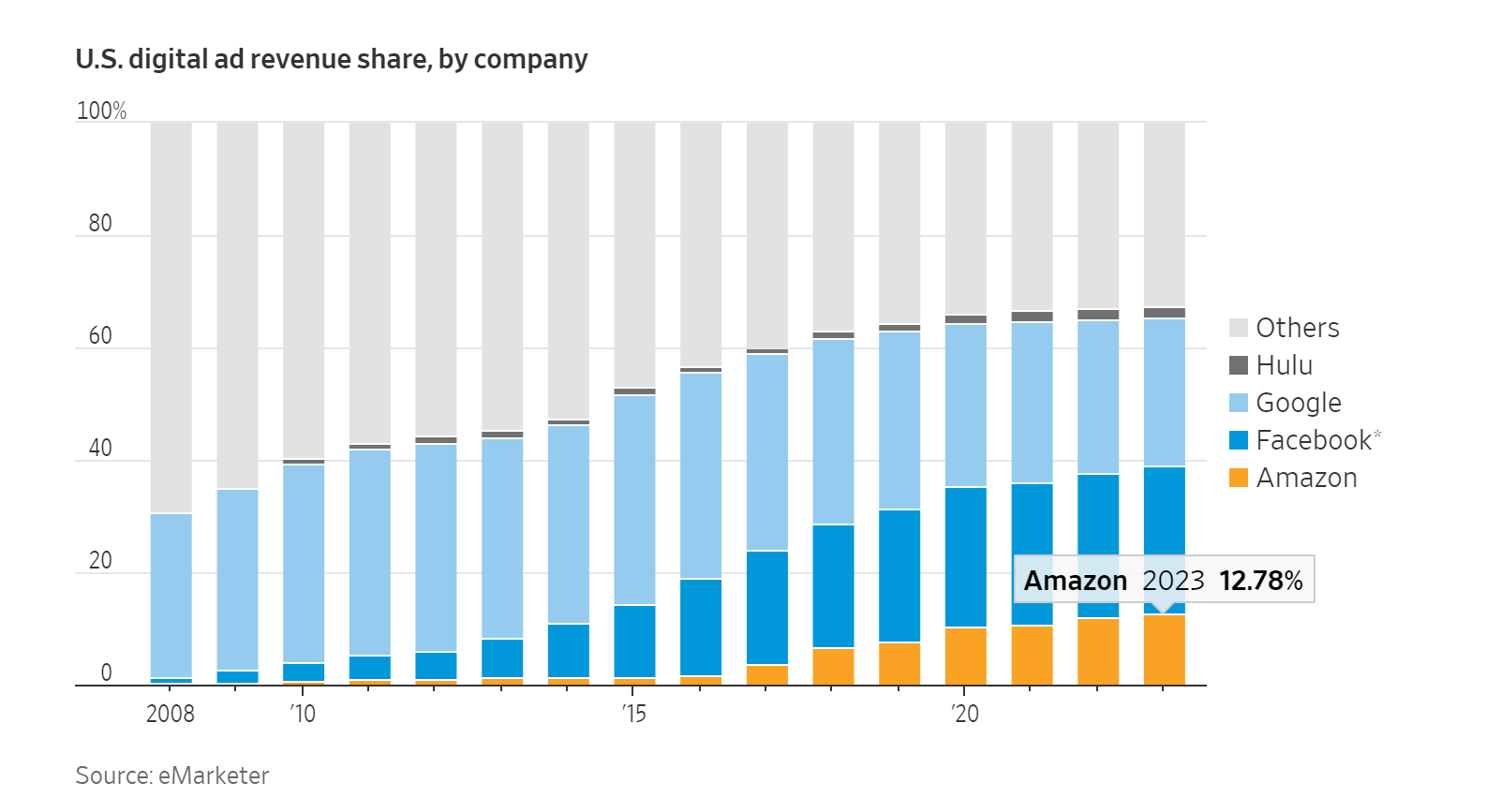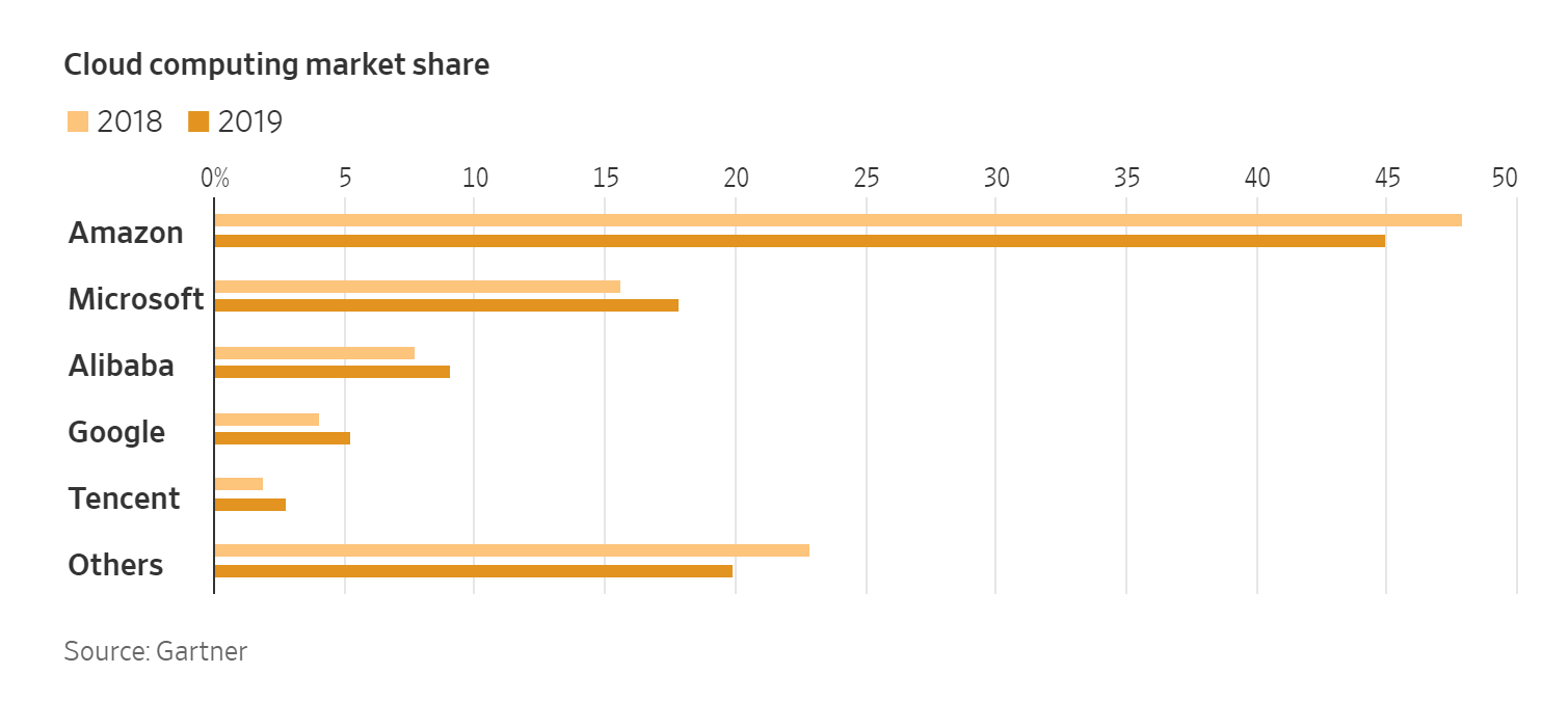 Amazon đã chiếm lĩnh mảng bán lẻ trực tuyến (online retail), cụ thể nắm 41% tất cả doanh thu bán hàng trực tuyến, theo một nghiên cứu của eMarketer. Nhưng công ty này cũng đồng thời tiên phong trong mảng dịch vụ điện toán đám mây và trở thành một thế lực trong ngành quảng cáo, cạnh tranh trực tiếp với Google của Alphabet Inc. và Facebook Inc. (Thị phần điện toán đám mây trong 2019: Amazon 45%).