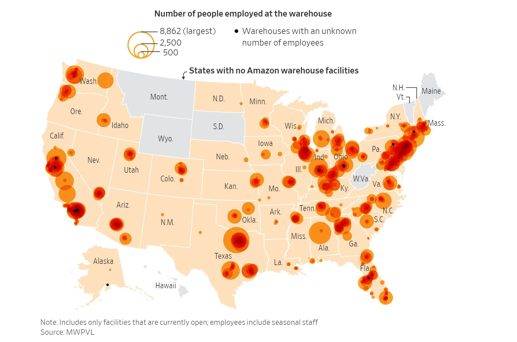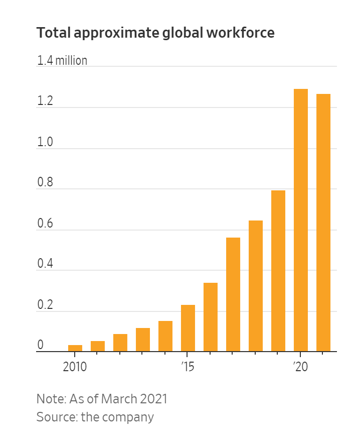 Chỉ có một số ít công ty có thể bắt kịp mức độ tuyển dụng mà Amazon thực hiện trong năm vừa qua. Công ty này đã thêm vào 500,000 nhân sự khắp thế giới trong năm 2020 và trong những năm tới có thể vượt xa Walmart Inc, nhà tuyển dụng lớn nhất nước Mỹ. Để đáp ứng nhu cầu khách hàng, Amazon phải mở rộng hệ thống nhà kho với tốc độ nhanh chóng xuyên khắp đất nước để có thể giao các gói hàng trong vòng một ngày hoặc ngắn hơn nữa.