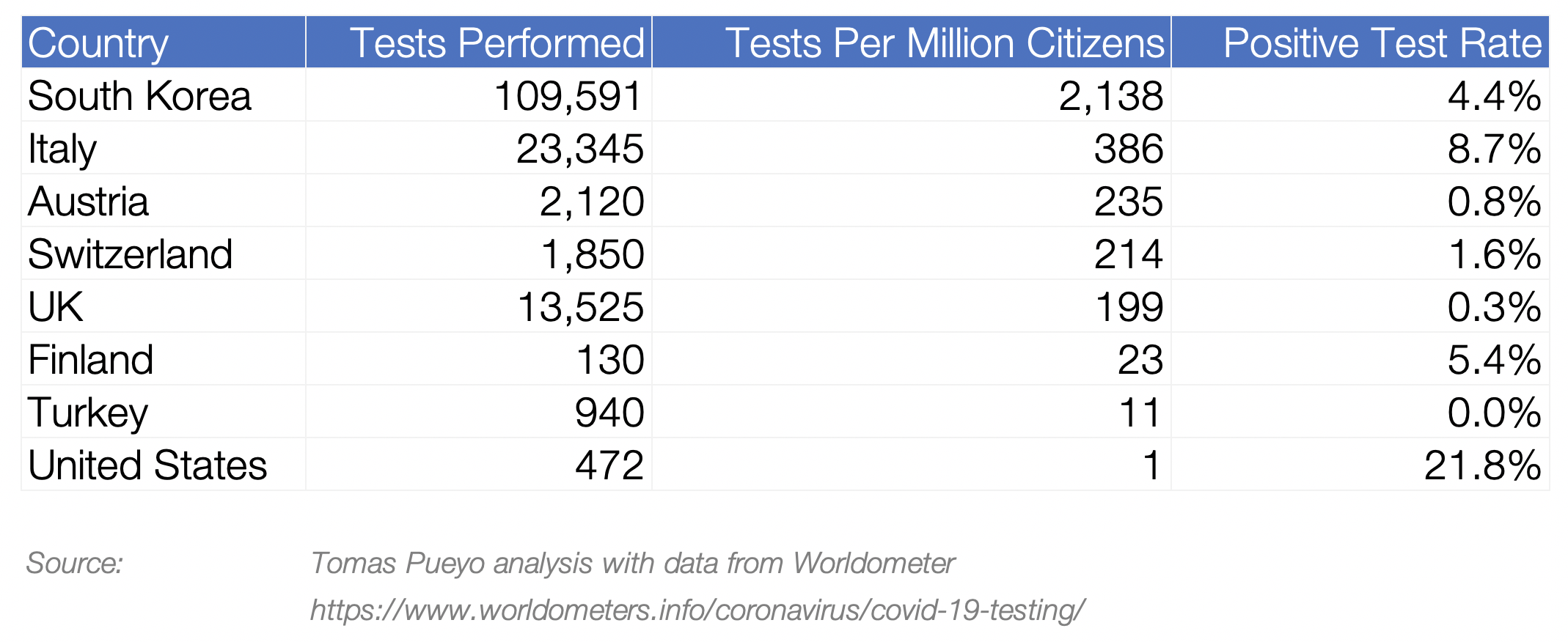 Bảng trên cho thấy Thổ Nhĩ Kỳ hiện tại không có ca nào nhiễm coronavirus nhưng số ca được xét nghiệm cao hơn 10 lần so với Mỹ. Tình hình không khả quan hơn ở Mỹ cho tới hôm nay: 8000 phiên xét nghiệm diễn ra nhưng chỉ chạm đến khoảng 4000 bệnh nhân.