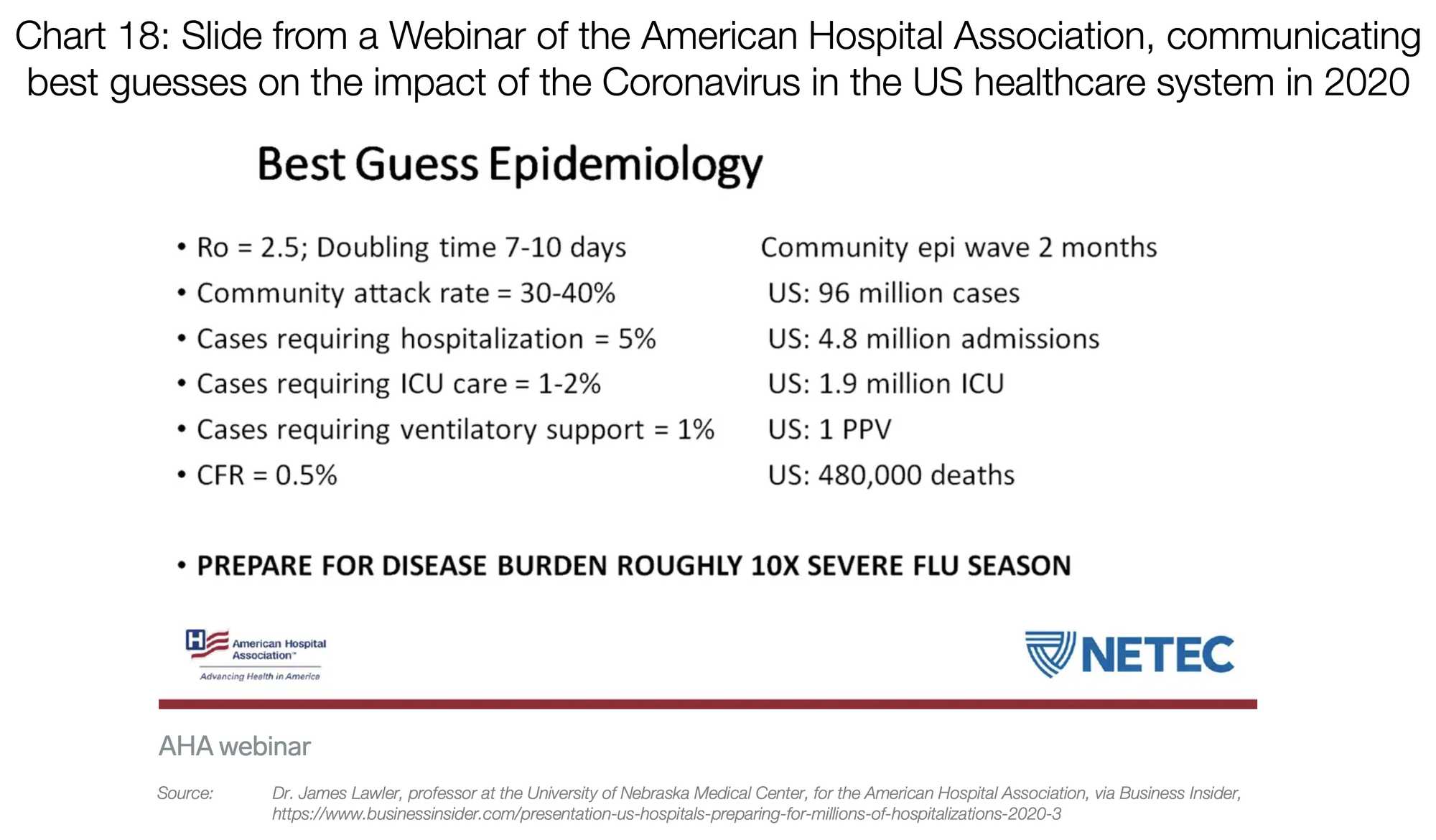 Vấn đề là các thiết bị như trên không thể sản xuất hoặc mua bán dễ dàng. Các đây một vài năm, nước Mỹ chỉ có tổng cộng 250 máy ECMO. Do đó, nếu bạn đột nhiên có 100 ngàn người nhiễm bệnh, nhiều trong số đó muốn đi xét nghiệm. Khoảng 20 ngàn người sẽ đòi hỏi phải được nhập viện, 5 ngàn cần có ICU, 1 ngàn cần các máy móc mà chúng ta hiện tại không có đủ số lượng. Đó mới chỉ là với 100 ngàn trường hợp nhiễm bệnh, chúng ta cũng chưa xét đến các vấn đề khác như khẩu trang y tế. Một đất nước giàu có như Mỹ lại chỉ có khoảng 1% khẩu trang cần thiết cho nhu cầu của các công nhân y tế (như 12M N95, 30M dùng trong phẫu thuật vs. 3.5B). Nếu có quá nhiều ca nhiễm cùng xuất hiện, chúng ta chỉ có khẩu trang dùng cho 2 tuần tổng cộng.