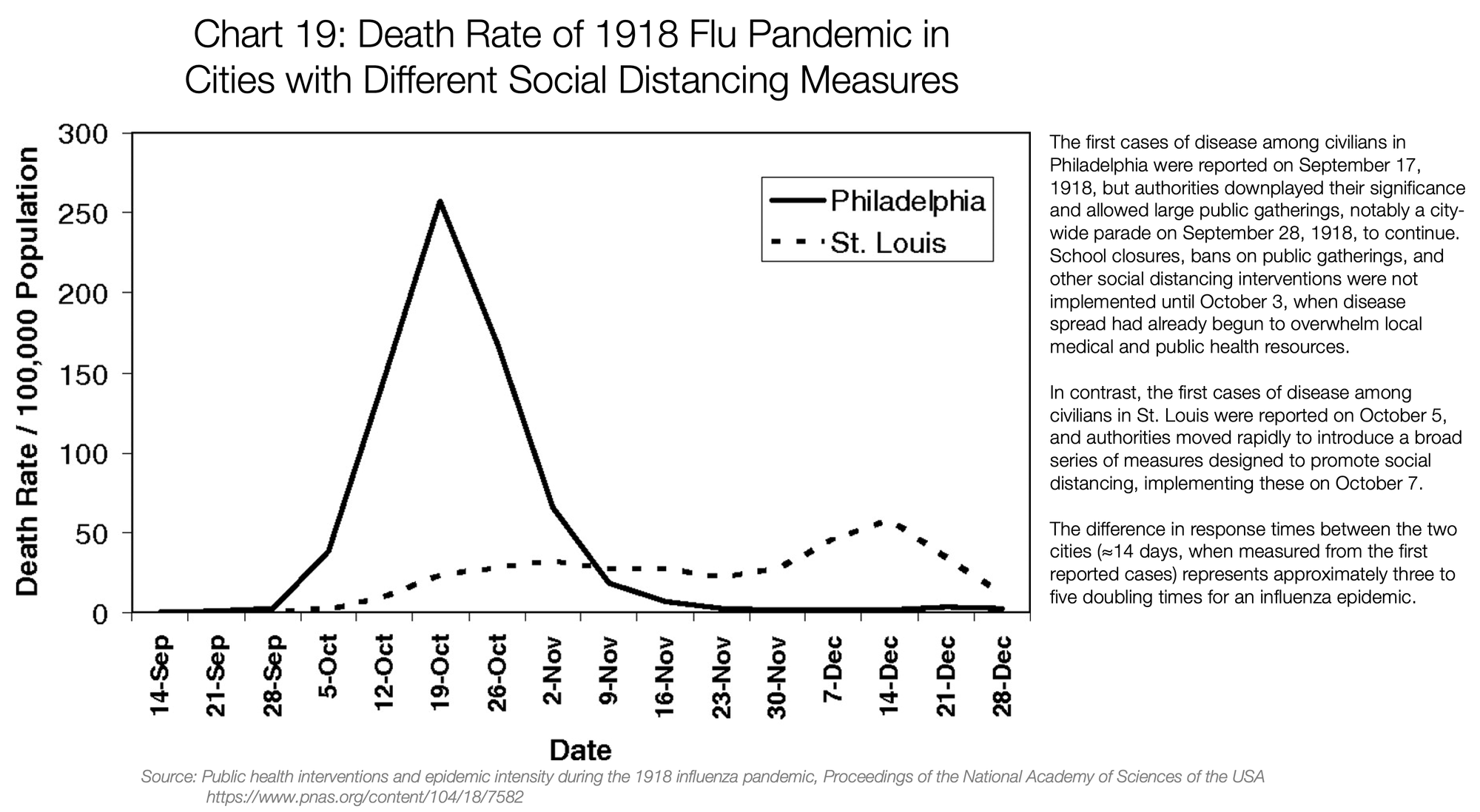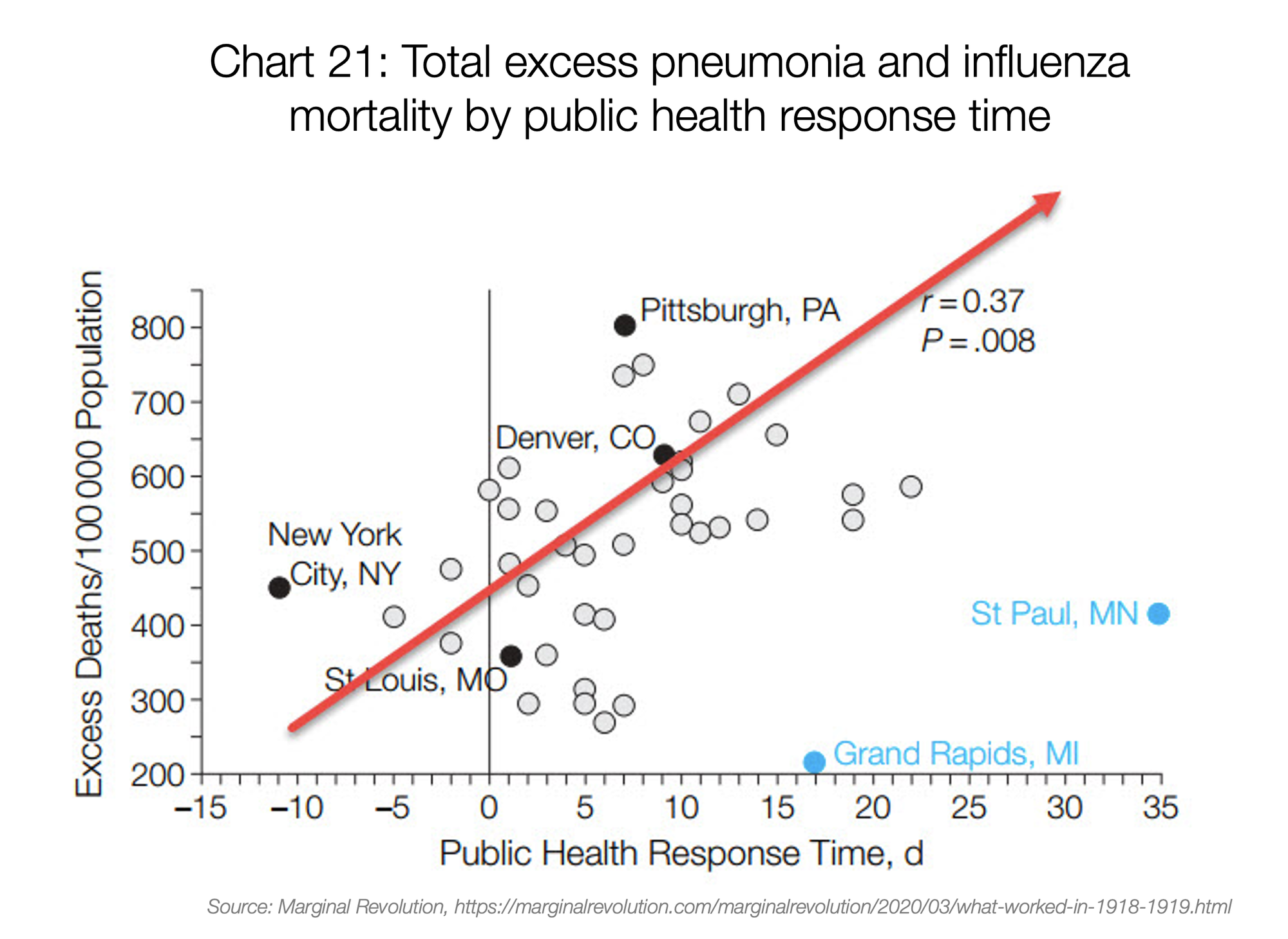 Biểu đồ này cho thấy số lượng tử vong ở mỗi thành phố trong dịch cúm 1918 của Mỹ phụ thuộc vào các giải pháp được tiến hành nhanh chóng ra sao. Ví dụ như, thành phố St. Louis tiến hành 6 ngày trước Pittsburg, đã có số người chết/dân số giảm một nửa. Trung bình, tiến hành các giải pháp sớm hơn 20 mươi ngày giúp giảm tỷ lệ tử vong một nửa.