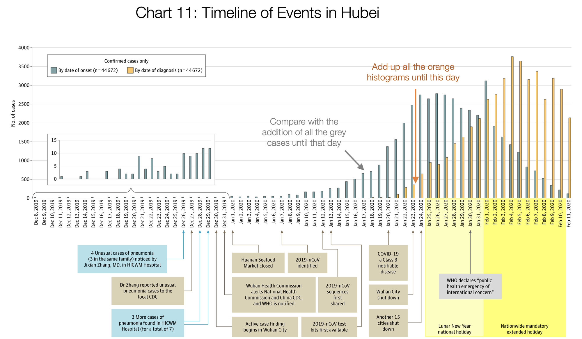 Đây là một trong những biểu đồ quan trọng nhất. Trong đó, các thanh màu cam chỉ cho ta thấy các ca bệnh “chính thức” (được chính quyền xác thực) ở tỉnh Hồ Bắc (Hubei) hay cụ thể là số người được xét nghiệm trong một ngày cụ thể. Các thanh màu xám là các ca nhiễm coronavirus thực sự hàng ngày. CDC Trung Quốc đo lường số liệu trên bằng cách hỏi han các bệnh nhân mới xuất hiện triệu chứng và đang trong quá trình xét nghiệm. Điều quan trọng là các ca nhiễm thực sự vẫn không được biết đến vào thời điểm đó mà chỉ có thể lần ra khi nhìn ngược về quá khứ: chính quyền không đo lường được những người chỉ vừa bắt đầu có triệu chứng mà chỉ thực sự ghi nhận được khi họ tìm gặp bác sĩ để xét nghiệm.