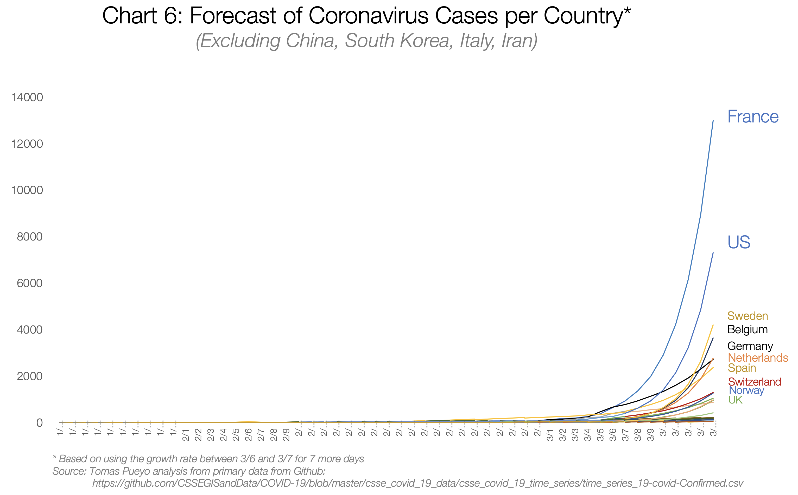 Chúng ta đã dần nhận ra sự tăng trưởng của các ca bệnh ở phương Tây do sự tiên đoán tệ hại một tuần trước đó. Tưởng tượng quá trình kiềm hãm bệnh không được tiến hành mạnh mẽ như ở Vũ Hán hoặc ở các nước phương Đông, chúng ta sẽ có một đại dịch khổng lồ. Hãy cùng quan sát một vài ca bệnh, như ở Bang Washington, Khu vực vùng vịnh San Francisco, Paris và Madrid.