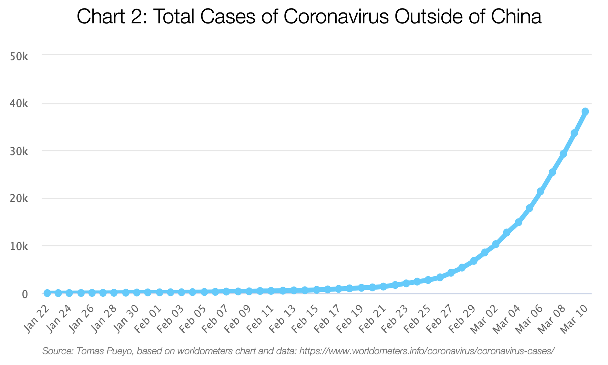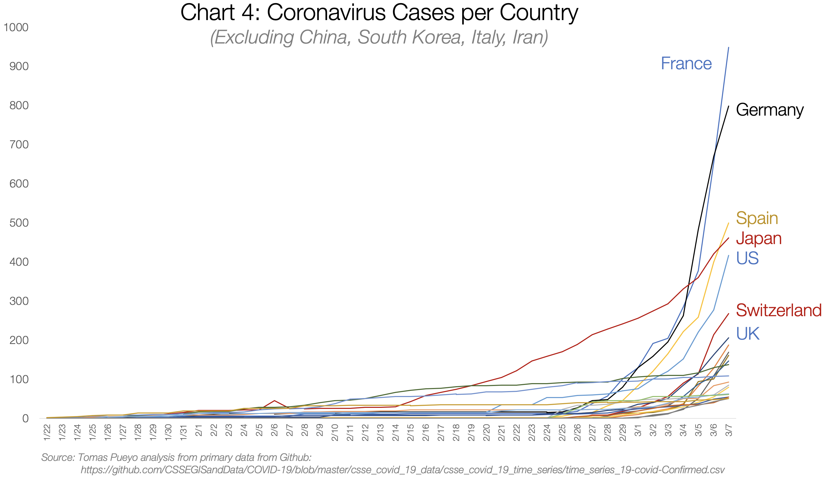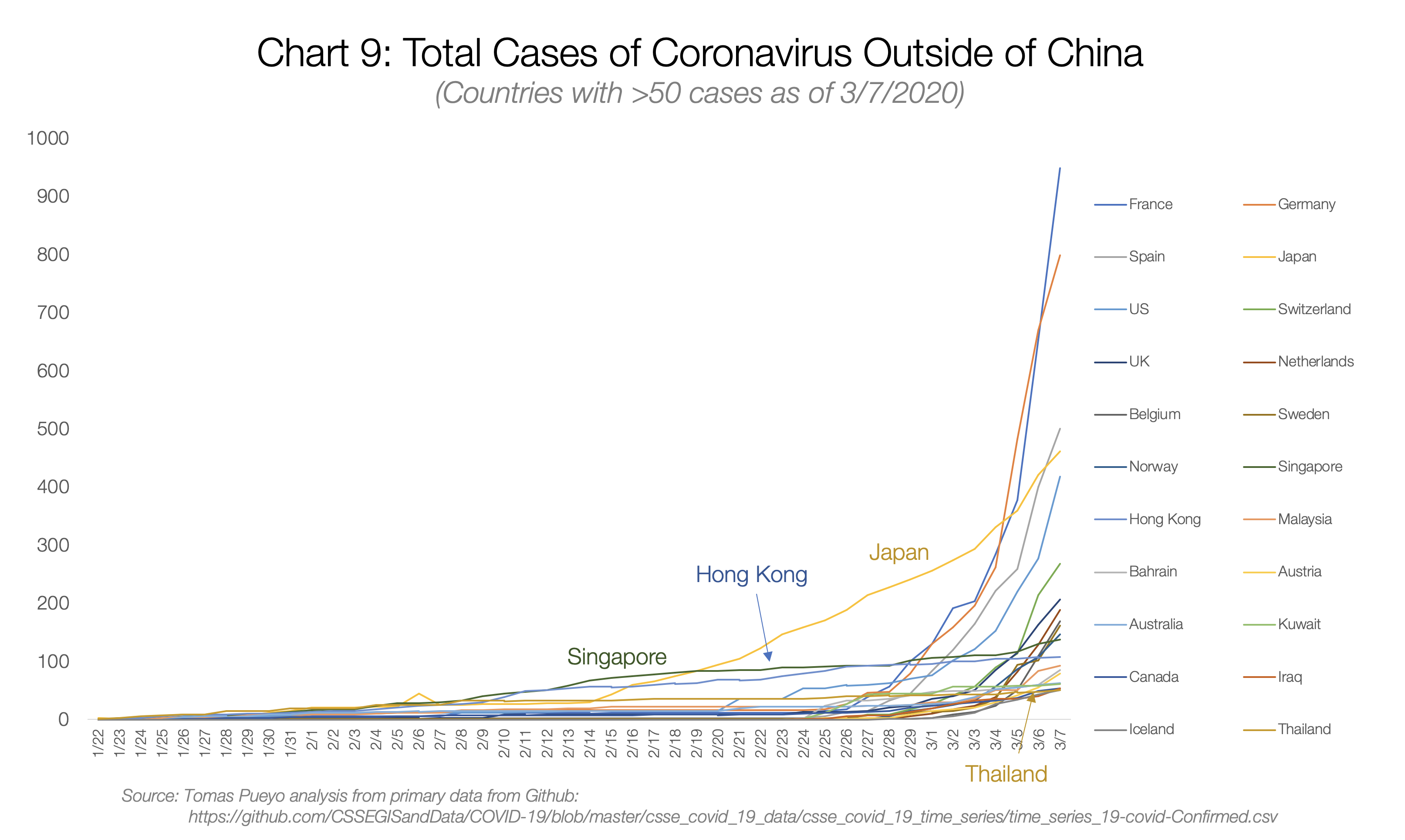 Mỗi đường thẳng đại diện cho một khu vực ở Trung Quốc có xuất hiện các ca nhiễm mà tất cả đều có khả năng vươn lên theo hàm mũ. Quan sát những gì xảy ra vào cuối tháng một, Trung Quốc đã thực sự thành công trong việc ngăn virus lan rộng. Trong khi đó, Nam Hàn, Ý và Iran dù có hẳn một tháng để học hỏi những gì diễn ra nhưng đã không thực sự nắm bắt. Họ bắt đầu với quá trình tăng theo hàm mũ của Hồ Bắc rồi các ca bệnh lần lượt vượt qua nhiều khu vực của Trung Quốc vào cuối tháng Hai.
