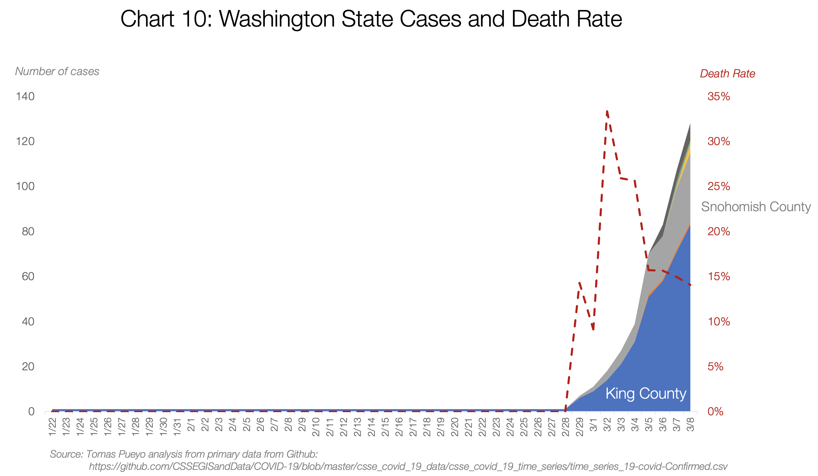 Bang Washington là Vũ Hán của Mỹ. Số lượng ca bệnh tăng theo hàm mũ. Hiện tại là 140. Nhưng có một điều thú vị diễn ra từ rất sớm, tỷ lệ người chết đã chạm ngưỡng, có lúc tiểu bang có tỷ lệ cứ ba ca bệnh thì có một người chết. Chúng ta biết rằng ở những nơi khác, tỉ lệ tử vong của coronavirus dao động từ 0.5% đến 5%. Làm thế nào mà con số đó ở đây lại là 33%? Virus đã lan tỏa ở tiêu bang này một vài tuần mà không bị phát hiện. Có vẻ như không chỉ có 3 ca bệnh. Chính quyền ban đầu chỉ biết đến 3 ca (một trong số đó chết) vì chỉ khi bệnh tình trở nặng, người dân mới đi kiểm tra xét nghiệm. Điều này cũng tương tự như biểu đồ cam và xám ở Trung Quốc: họ chỉ biết các thanh màu cam (ca nhiễm chính thức) và chúng trông rất tốt (chỉ có 3). Nhưng thực tế, có tới hàng trăm hay hàng ngàn ca bệnh thực sự.