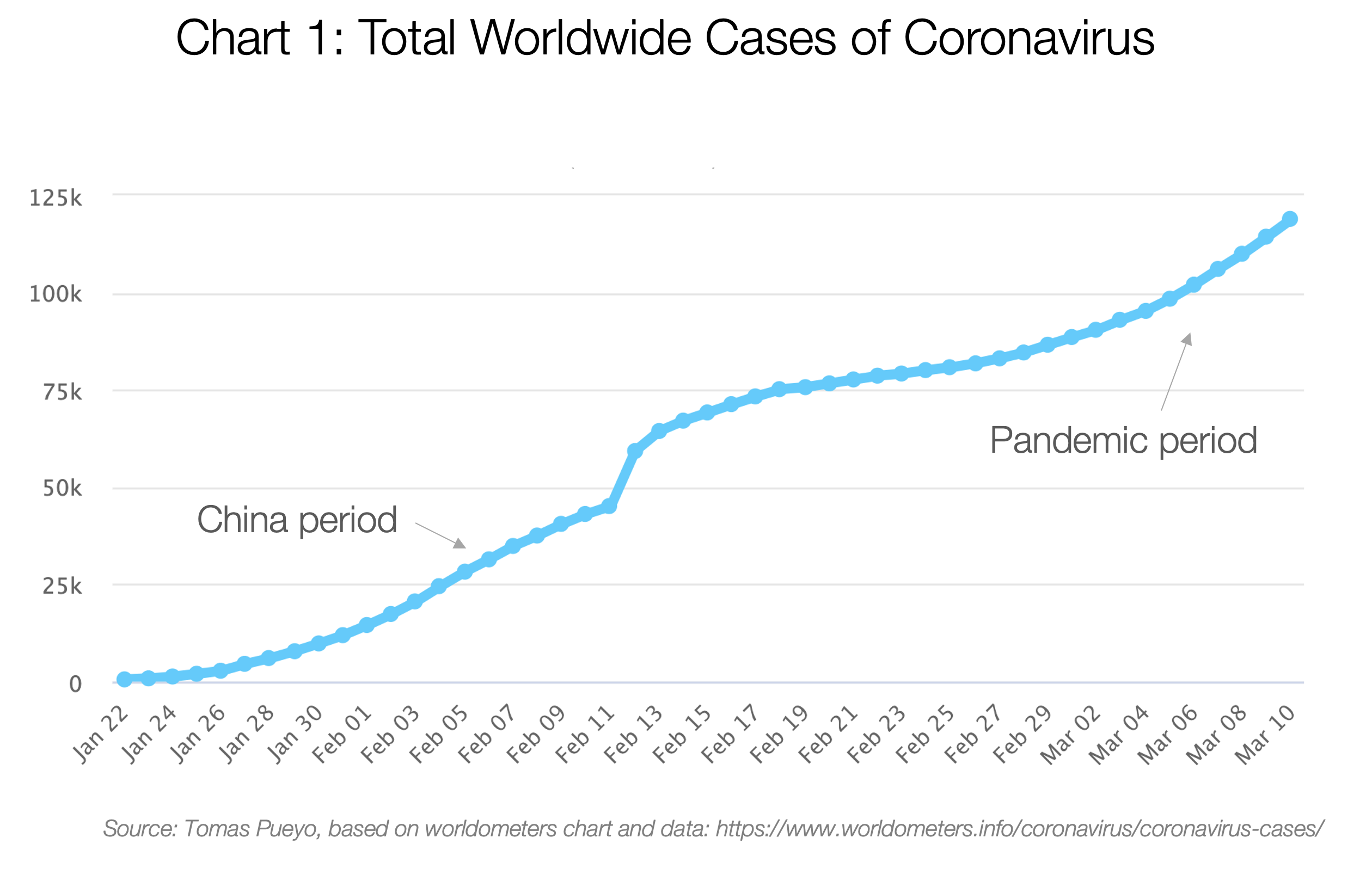 Tổng số ca nhiễm tăng theo hàm mũ cho đến khi Trung Quốc chặn đứng bệnh dịch. Nhưng sau đó, virus lại rò rỉ ra thế giới bên ngoài và biến thành đại dịch (pandemic) toàn cầu mà không ai có thể chặn đứng.