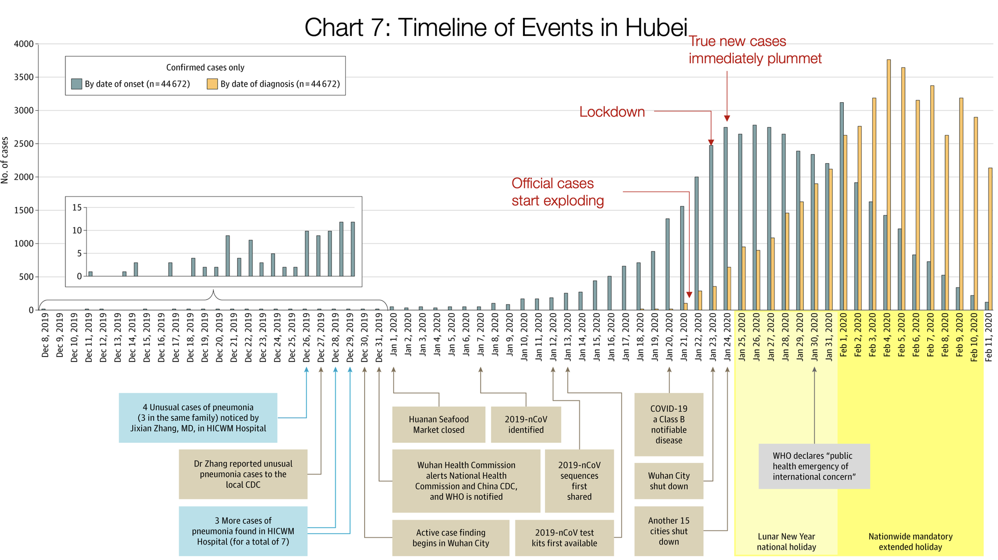 Các thanh màu cam cho chúng thấy những con số mà chính quyền biết còn màu xám diễn tả điều đang thực sự diễn ra. Vào ngày 21 tháng 1, các ca bệnh được xét nghiệm mới (màu cam) bùng nổ: có khoảng 100 ca bệnh mới. Trong khi đó thực tế ngày đó có tới khoảng 1500 ca bệnh mới, gia tăng theo hàm mũ nhưng chính quyền không chân nhận ra, họ chỉ đột ngột biết rằng có 100 ca nhiễm của một loại bệnh mới. Hai ngày sau đó, chính quyền Trung Quốc cho đóng cửa Vũ Hán, thời điểm số ca bệnh mới được xét nghiệm là gần 400. Hãy nhìn vào con số: quyết định đóng cửa thành phố được đưa ra khi có 400 ca bệnh mới trong một ngày, nhưng con số thực tế mà chính quyền có lẽ không thực sự biết là 2500 ca.